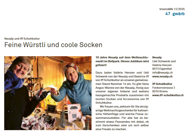 Am gemeinsamen Stand Nummer 14 präsentieren die Neualp und Iff Schuhkultur dieses Jahr coole Socken, feine Würstli und weitere hausgemachte Produkte von der Neualp.